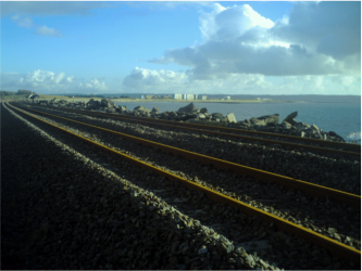 Two photographs showing the damage done to the sea wall between Pwll and Sandy during the gales of January 2014